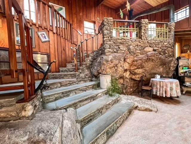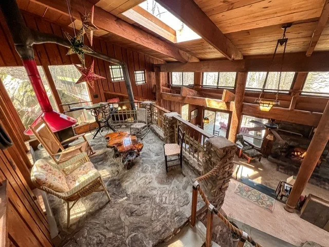 Secluded, resting on the side of the mountain and surrounded by woods, the Cliff House is uniquely constructed. Huge boulders form walls, and old shipyard beams support the ceiling. There are antique glass and mahogany doors from The Bank of London, weathered chestnut barn siding, and much more! Large windows and spacious decks look out into the treetops and mountains, yet you're just ten minutes from downtown Asheville.